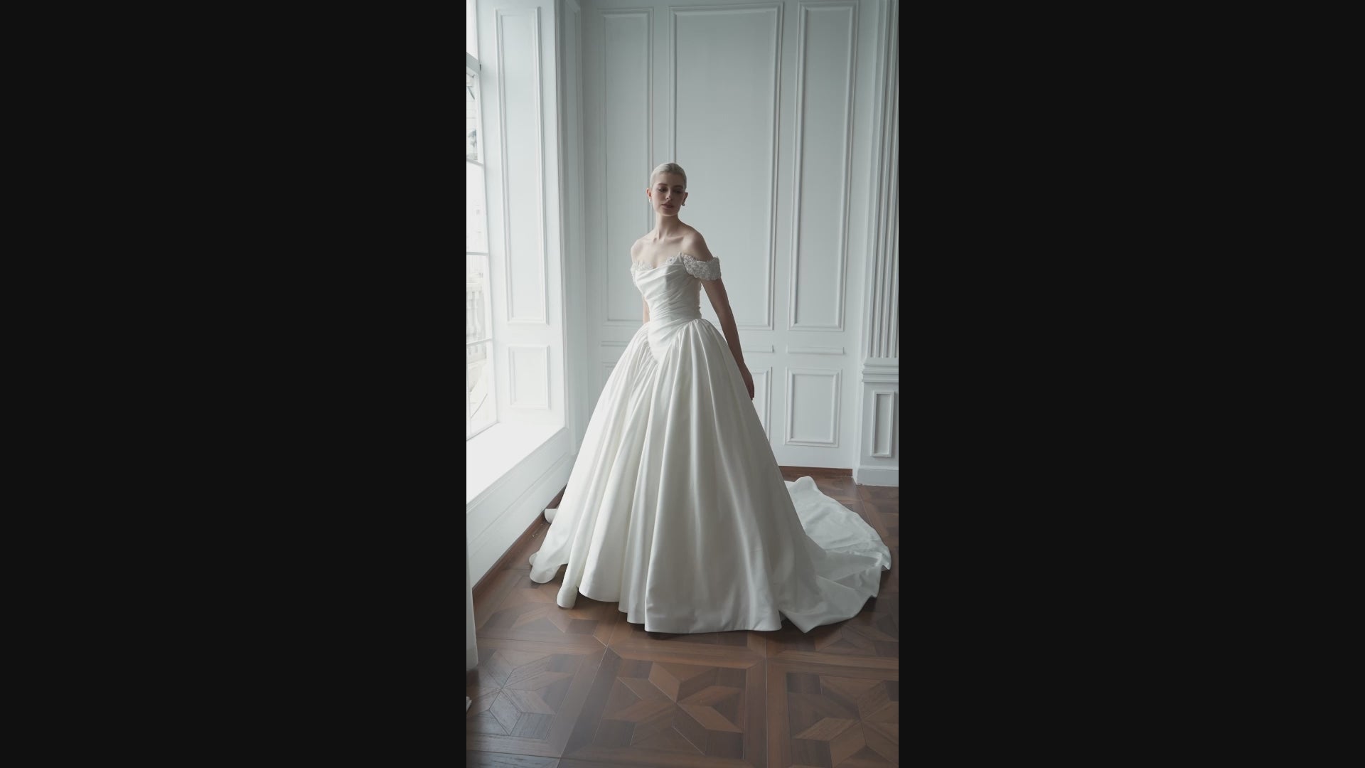Das schulterfreie Oberteil mit weich drapiertem Bustier sorgt für sicheren Halt und eine moderne, selbstbewusste Silhouette. Die fein verzierten Off-Shoulder-Träger setzen dezente Akzente und geben dem cleanen Look eine elegante Struktur.