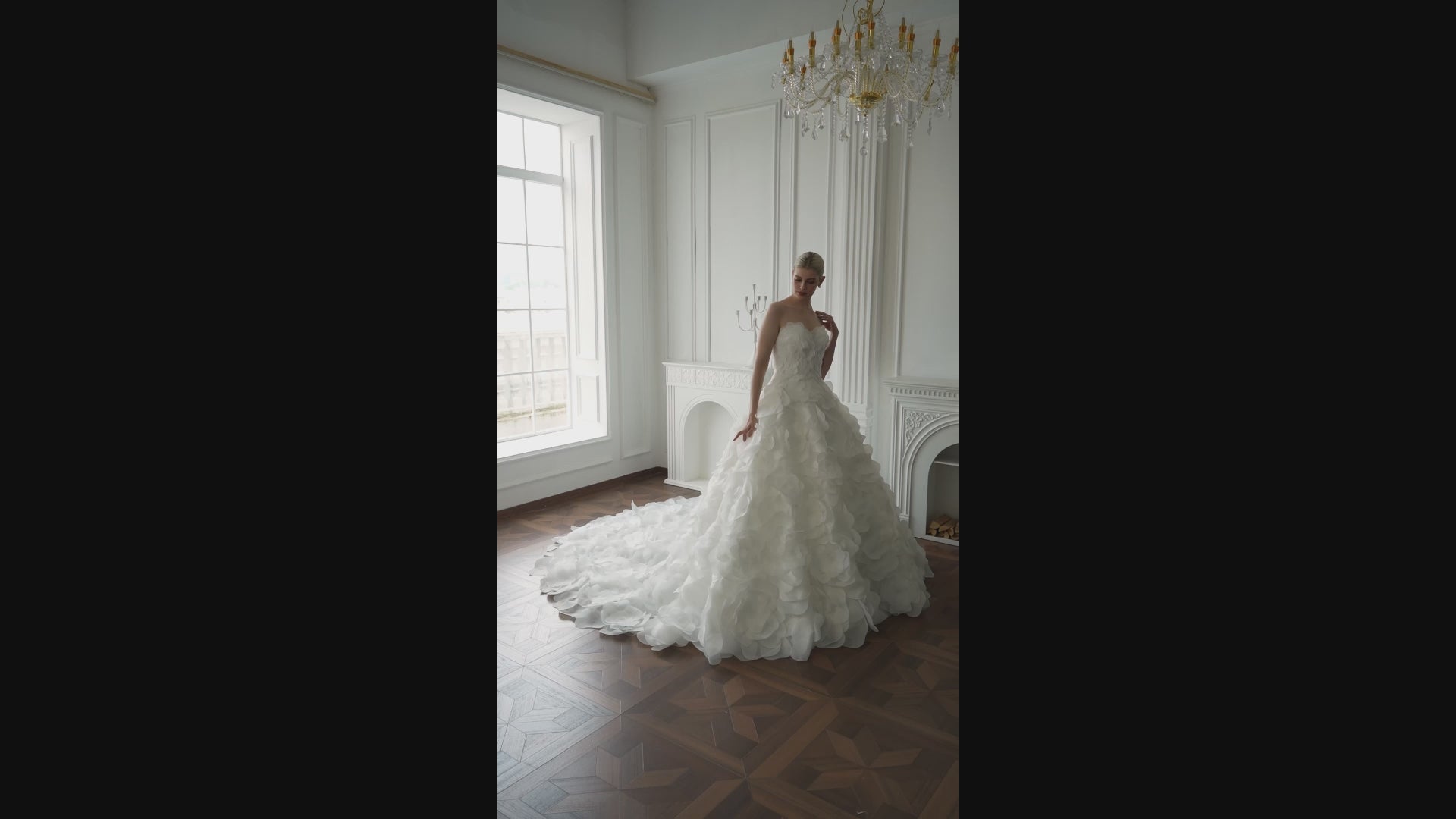 Der voluminöse Rock aus luftigen, dreidimensionalen Organza-Blütenlagen verleiht dem Kleid seine unverwechselbare Energie. Trotz des üppigen Looks wirkt das Material federleicht und folgt jeder Bewegung fließend – ideal für Bräute, die aktiv feiern und sich frei fühlen möchten. Die lange, weich fallende Schleppe verstärkt die Dynamik des Designs.